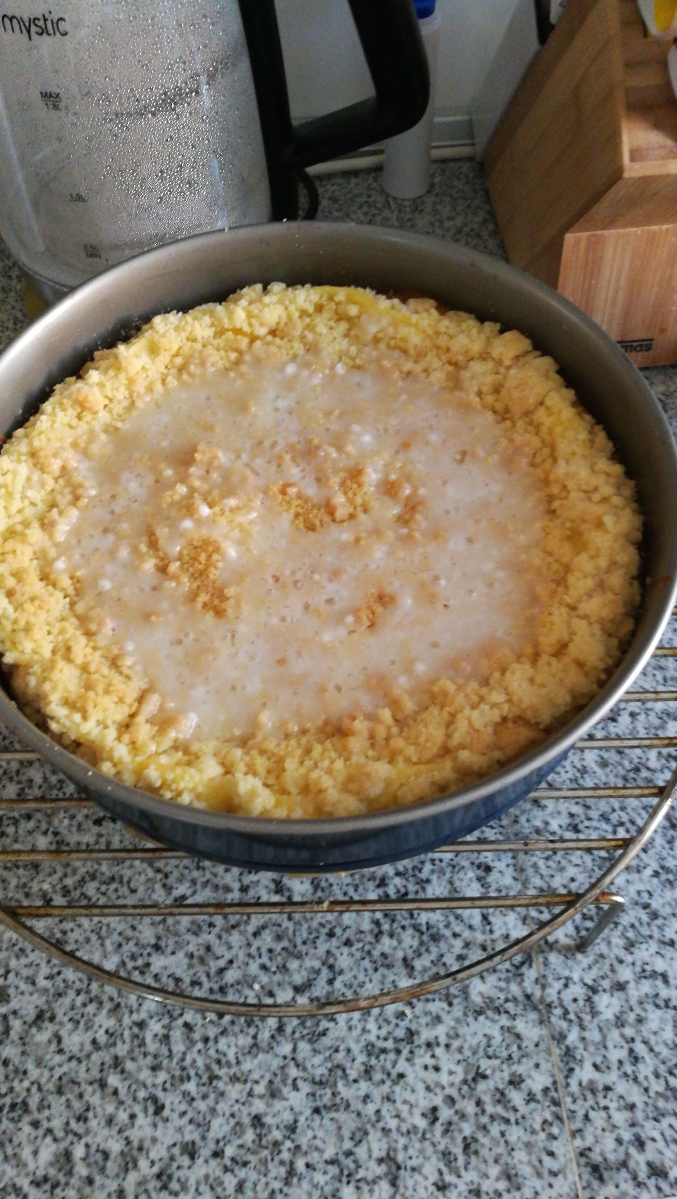 - Auf der mittleren Schiene ca. 30 Minuten backen. Der Kuchen ist fertig, wenn die Streusel langsam braun werden.